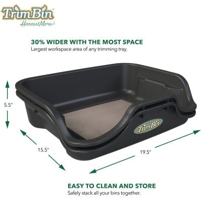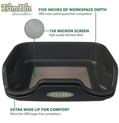 Mit den Abmessungen von 43 x 38,1 x 6,4 cm bietet die TrimBin ausreichend Arbeitsraum für verschiedene Erntearten. Das austauschbare Edelstahlsieb gewährleistet Langlebigkeit und einfache Wartung. Die glatte Oberfläche lässt sich problemlos reinigen und bei stärkeren Verschmutzungen mit hochprozentigem Alkohol säubern.